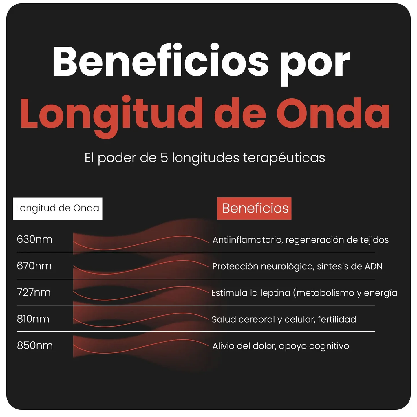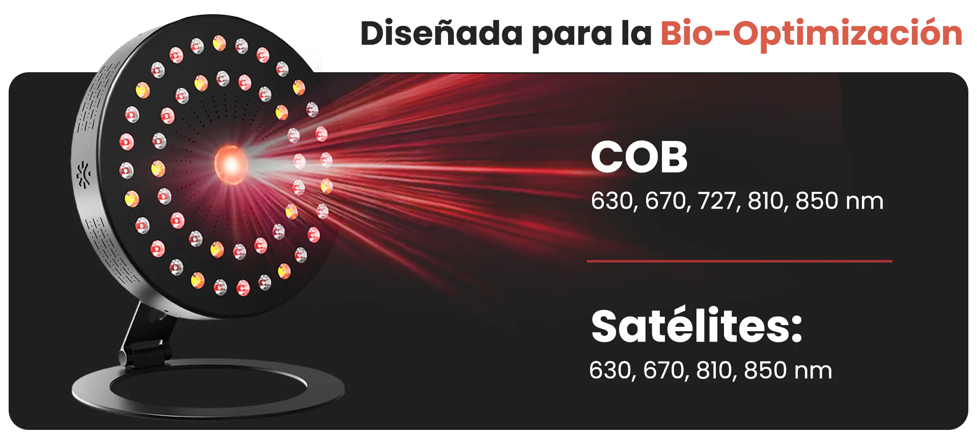 Red + Infrarrojo | Longitud de onda 727 nm | Cero flicker | Sin EMF | Bajo consumo